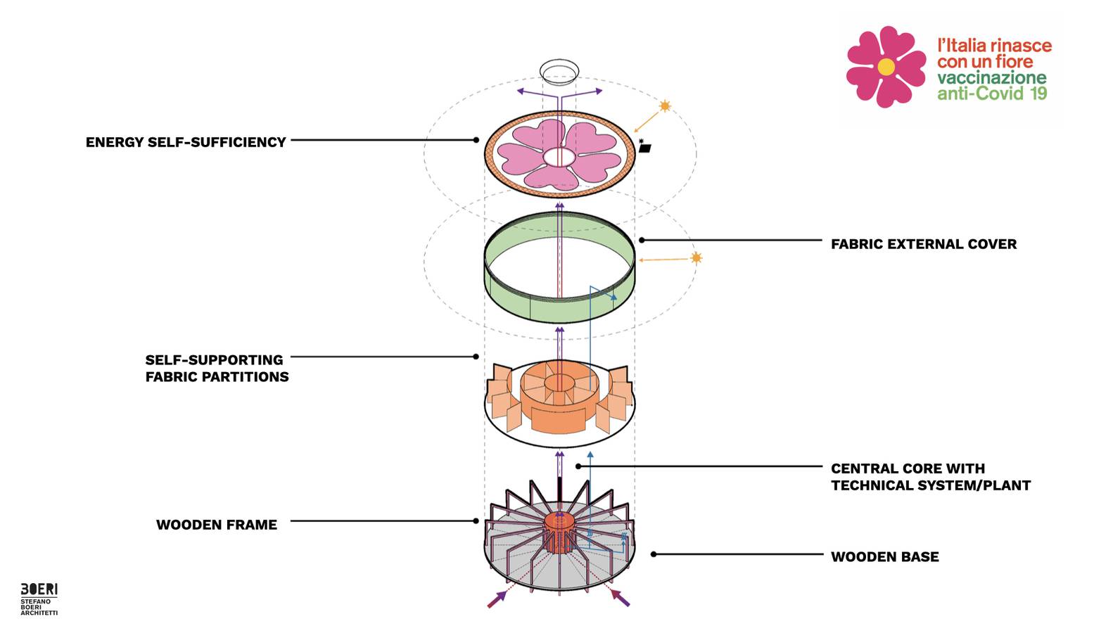 Ο όλος σχεδιασμός υπηρετεί την επικοινωνία του μηνύματος υπέρ του εμβολιασμού, αποσκοπώντας στο να καμφθούν οι αντιστάσεις των αρνητών. Για τον λόγο αυτό, όπως εξηγεί ο ίδιος ο σχεδιαστής επιλέχθηκε μια αισιόδοξη αρχιτεκτονική, η οποία αξιοποιεί την πρίμουλα ως σύμβολο της διαρκούς αναγέννησης. Σε ό,τι αφορά το πρακτικό μέρος και για να διευκολυνθεί η ταχεία ροή όσων πρόκειται να εμβολιαστούν σε αυτά τα σημεία, ο Μποέρι σχεδίασε την κυκλική βάση και ένα προκάτ σκελετό από ξύλο.