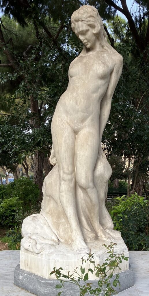 Το 1919 ο Νάξιος γλύπτης Γρηγόριος Ζευγώλης (1886-1950) εξέθεσε στην Αθήνα γύψινο πρόπλασμα έργου του που απεικόνιζε, σε μαλακή σιγμοειδή στάση, την Εύα γυμνή, μετά από το προπατορικό αμάρτημα, να κρατάει στο δεξί χέρι της το μήλο και να συμπληρώνεται δεξιά στο κάτω μέρος της με το φίδι που την είχε εξαπατήσει. Πίσω της φαίνεται κομμάτι βράχου.