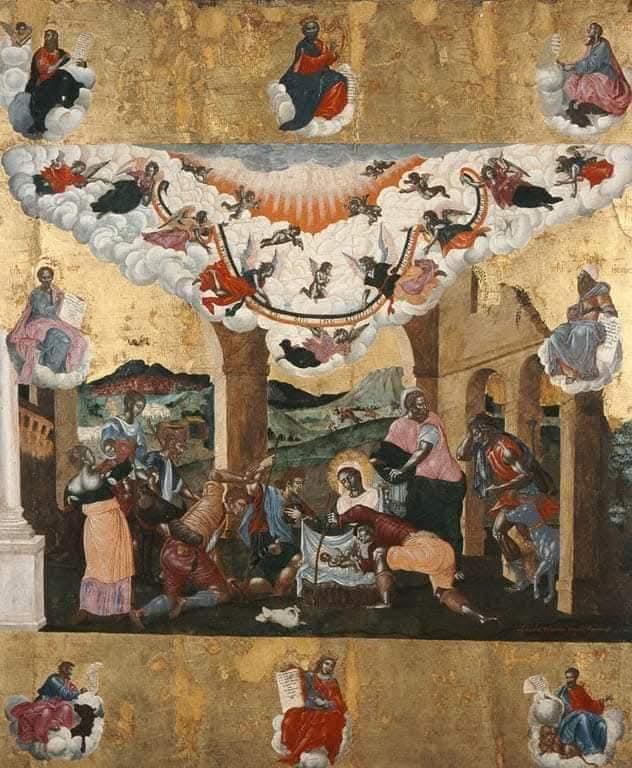 Επειδή εδώ δεν έχουμε ένα ηθογραφικό, κοσμικό γεγονός – όπως αποδίδεται το Δράμα του Σπηλαίου στην τέχνη της Αναγέννησης – αλλά δόγμα και μυστήριον μέγα. Ο θεατής προτού συγκινηθεί, πρέπει να θαυμάσει και να φρίξει. Αφού το άπειρο εν γαστρί παρθένου χωρείται.