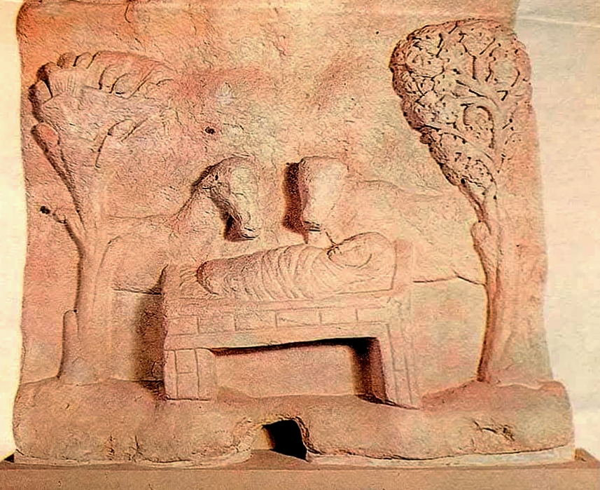 Λίγο μετά και στη Νάξο – η οποία αναδεικνύεται σε σπουδαίο, θρησκευτικό κέντρο για τον χριστιανισμό ως την Εικονομαχία, κάτι ανάλογο με την γειτονική Δήλο και τη λατρεία του Απόλλωνα – εντοπίζουμε μαρμάρινο ανάγλυφο, στο οποίο εικονίζεται το θείο Βρέφος επί τραπέζης (αναφορά στη θεία ευχαριστία;) πίσω του δύο ζώα και αριστερά και δεξιά του τα δύο συμβολικά δέντρα της αιωνίου ζωής: Τον φοίνικα και την άμπελο . Τίποτε άλλο… Χωρίς την Παρθένο, τον Ιωσήφ, τους βοσκούς, τους μάγους, τους αγγέλους, το σπήλαιο, τα ζώα ή το λουτρό του νεογέννητου. Μόνο τα απολύτως αναγκαία για την αφήγηση.