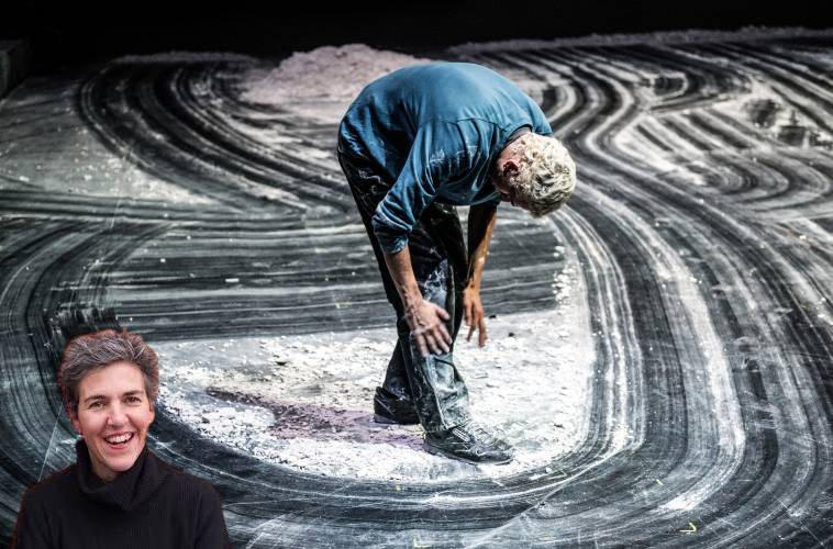 Ως μεταφορά στον κόσμο της ύλης, ο γύψος, που κυριαρχεί στο σκηνικό της παράστασης και μεταλλάσσεται σε άπειρες εικόνες με τις κινήσεις των χορευτών, είναι κι αυτός ένα συνδετικό υλικό. Τοπίο, τόπος και ερείπια, όρια, σύνορα και μπάζα δημιουργούν εικόνες που μας είναι οικείες: η φύση δίνει τη θέση της στο αρχιτεκτονικό τοπίο, κτίσμα ανθρώπινο και γέννημα πολιτισμού, κι εκείνο με τη σειρά του στο τοπίο της καταστροφής – ένα ανοιχτό πεδίο αναδόμησης.